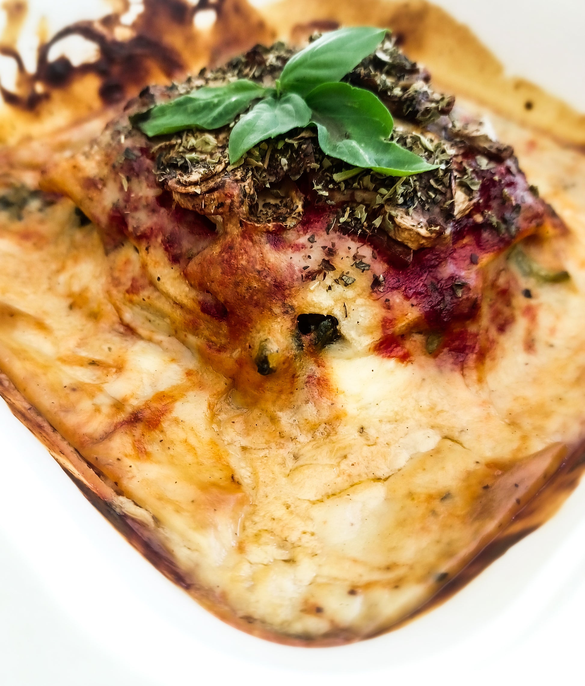 Ingredientes: placas de lasanha caseira (farinha de arroz, água filtrada, linhaça moída, goma xantana, sal), espinafres, cogumelos, cottage de amêndoa (amêndoa fermentada, água filtrada, agar agar, sumo de limão, azeite, sal), cebola, alho, azeite, molho caseiro de tomate (tomate fresco, pasta de tomate, sumo de maçã natural, azeite, óregãos, sal), béchamel de caju (amêndoas, água filtrada, caju, azeite, levedura nutricional, sal preto, noz moscada).